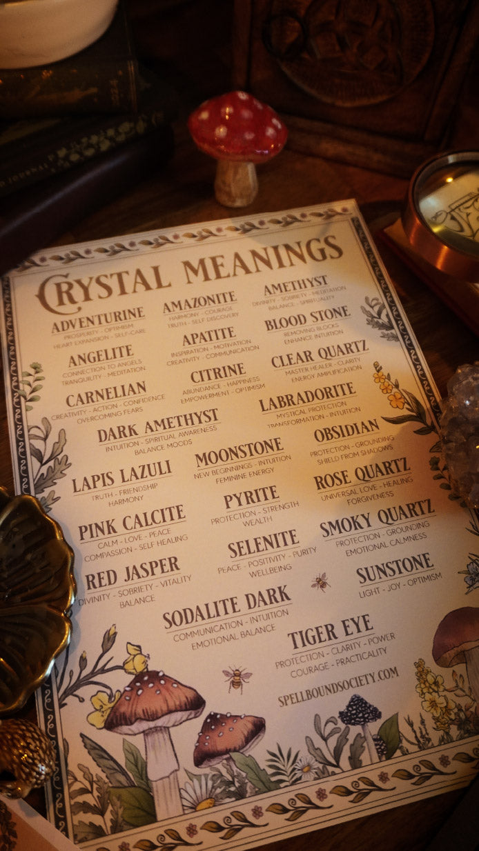 I originally made this crystal meaning poster for my shop, something sweet and helpful for customers to browse while choosing their crystals. But once it was finished, the soft botanical mushrooms, the gentle earthy feeling… it felt far too cute to keep tucked away behind the counter.