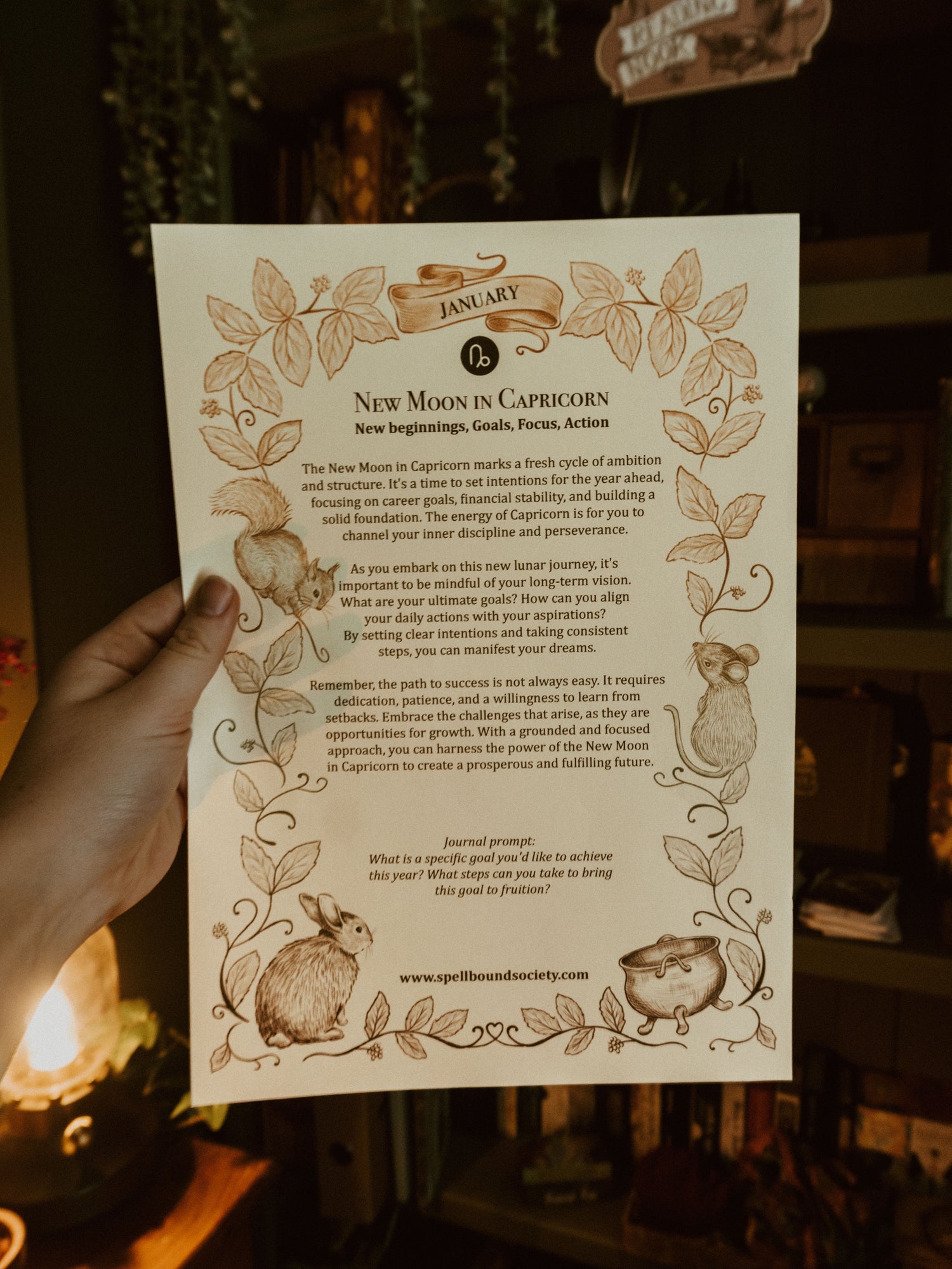 January's Full Moon is in Cancer, and the New Moon for January is in Capricorn. I illustrated and wrote a grimoire page to work with each of these Moon phases along with a monthly manifestation page, to write your wishes and dreams for the month.