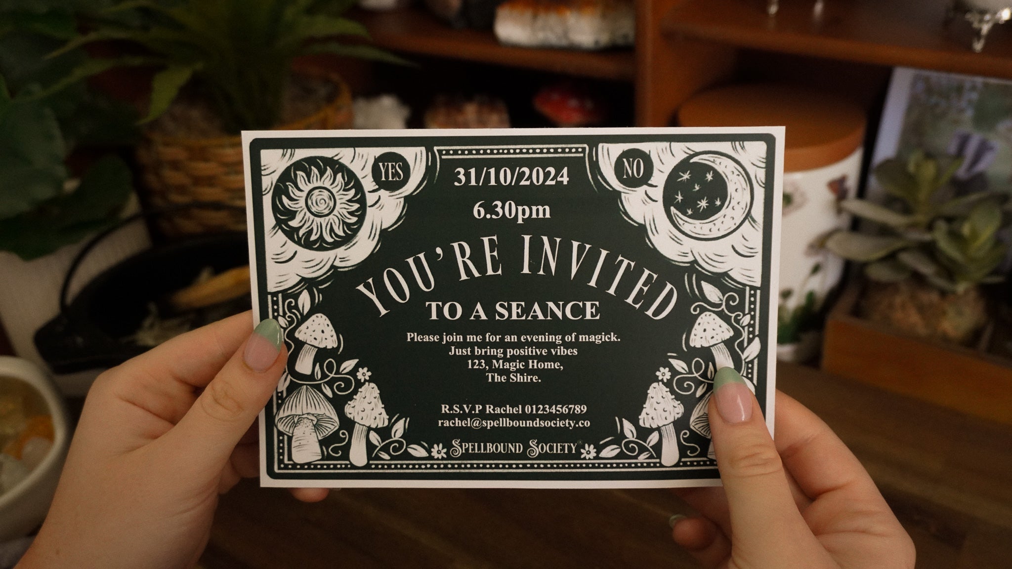 I have illustrated this seance invitation and added editable text boxes so you can personalize your event information. Of course I had to include mushrooms, because us Green Witches love them!