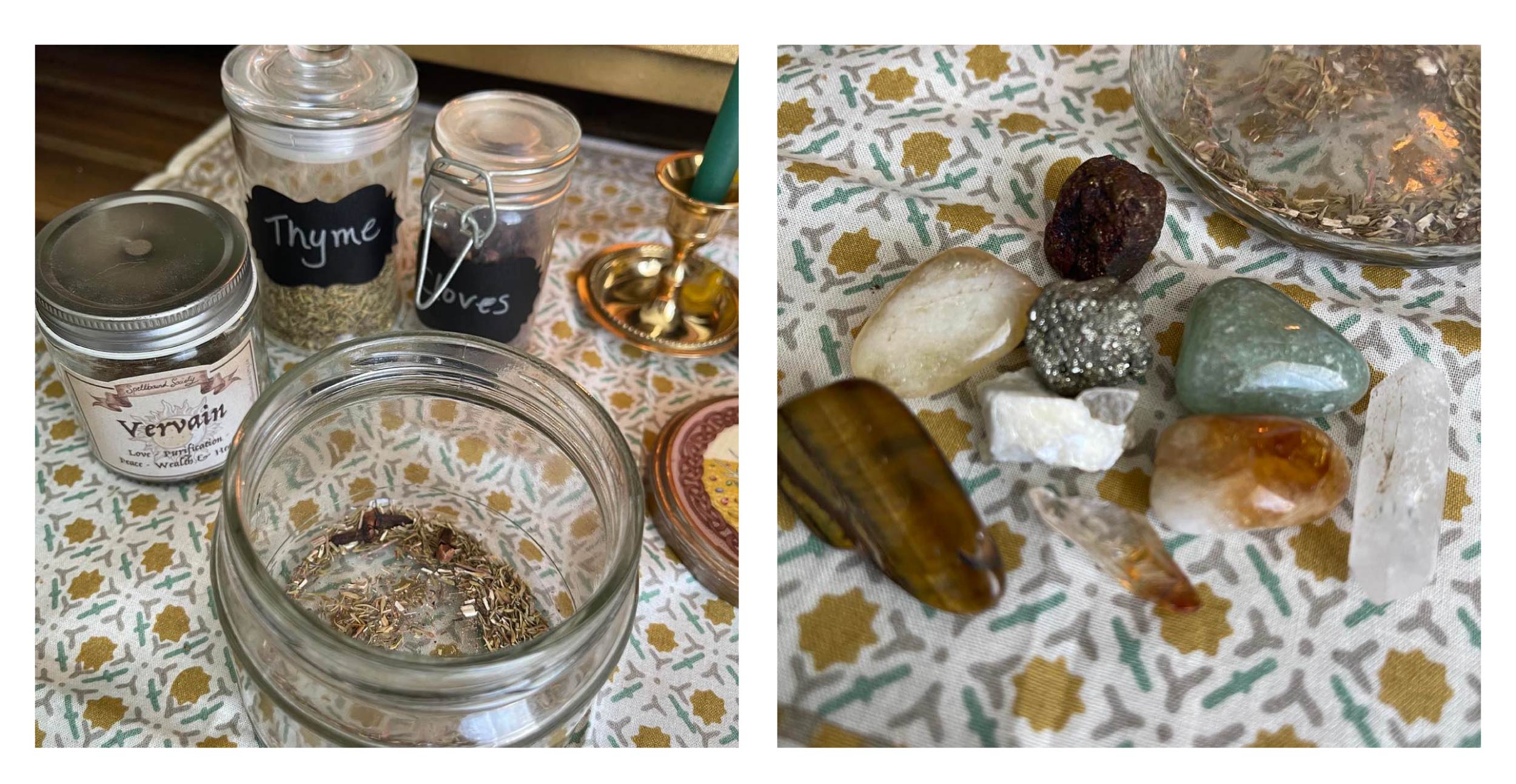 Add your herbs and crystals. For my herbs I used 3 pinches of Thyme and Vervain and 3 cloves. I used 9 crystals: following the Celtic magical tradition with the number 3 and multiples of 3.