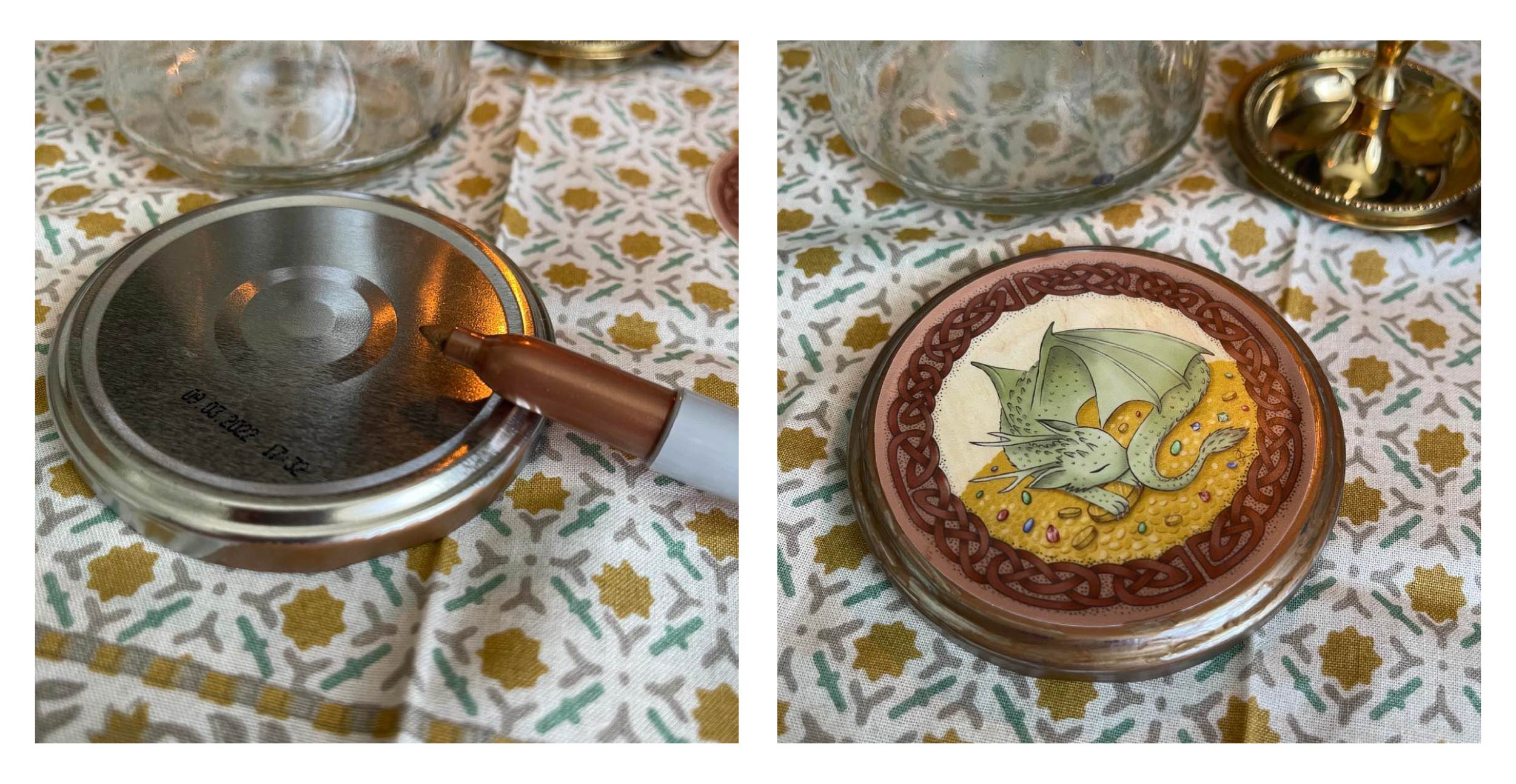 Decorate your jar lid: I used a copper sharpie around the edge and my lucky dragon vinyl sticker.