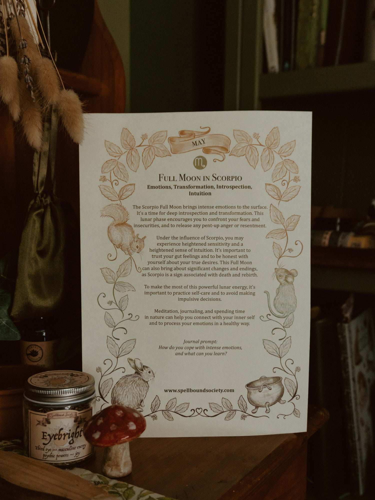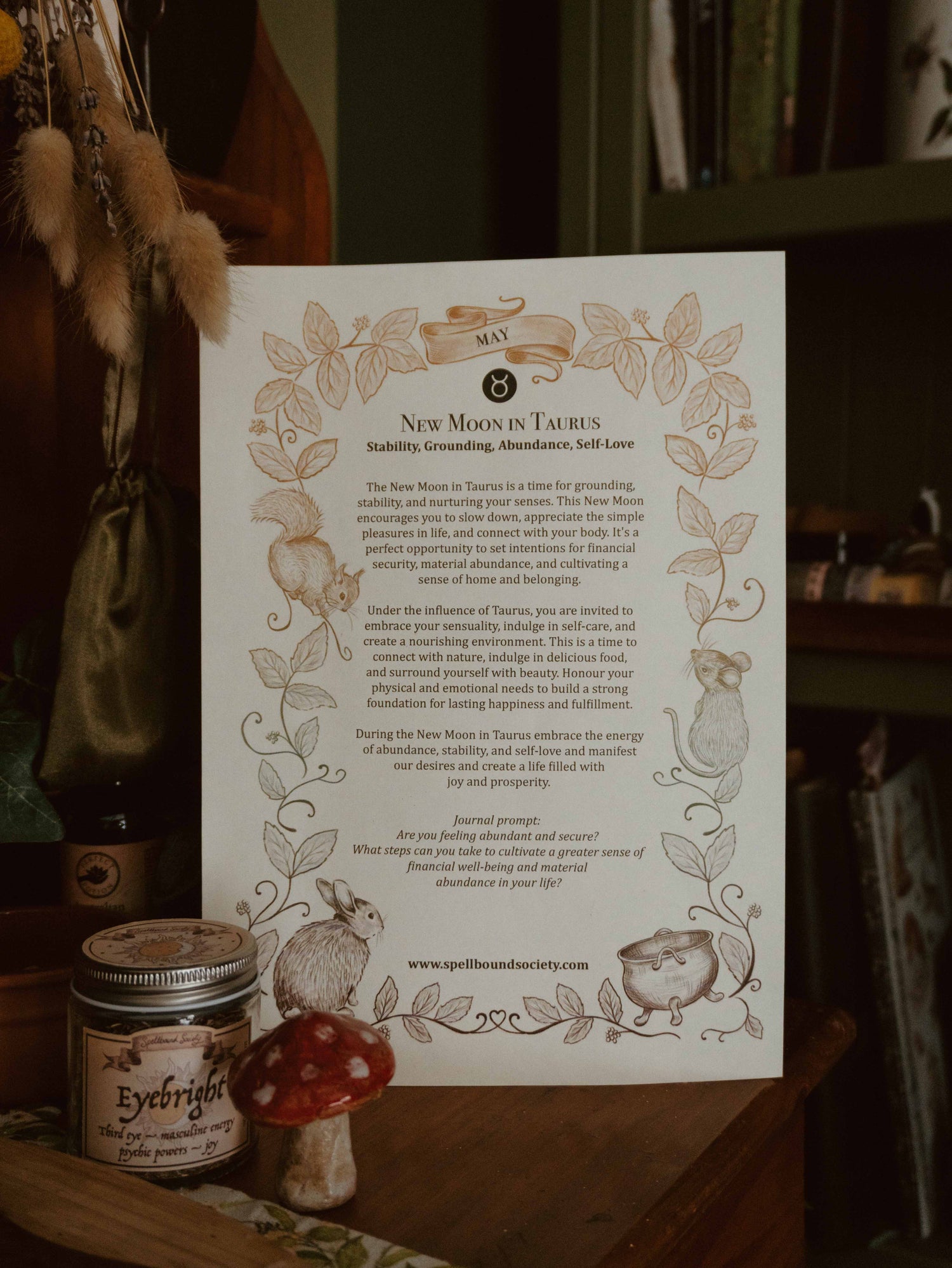 May's Full Moon is in Scorpio, and the New Moon for May is in Taurus. I illustrated and wrote a grimoire page to work with each of these Moon phases along with a monthly manifestation page, to write your wishes and dreams for the month.