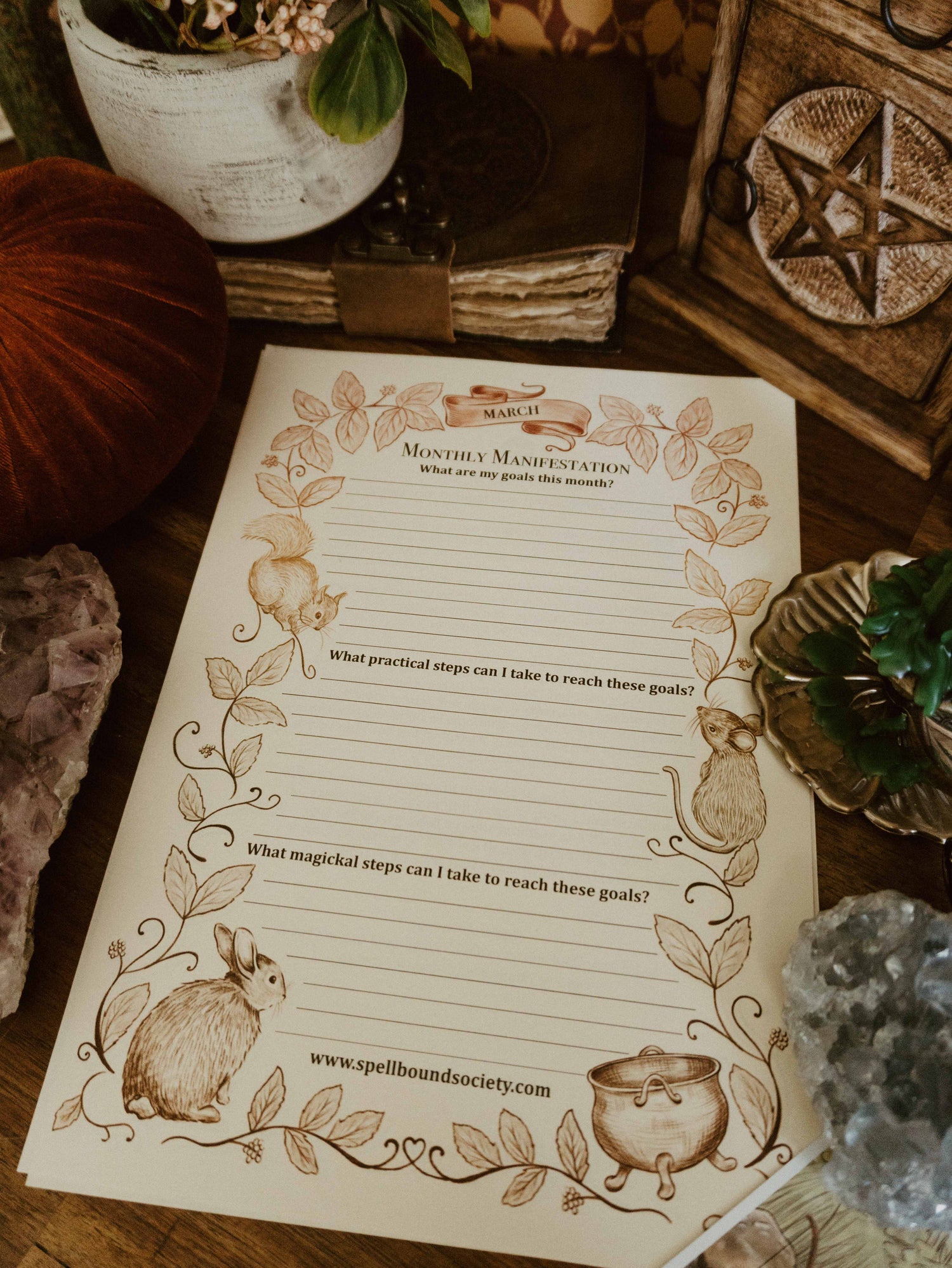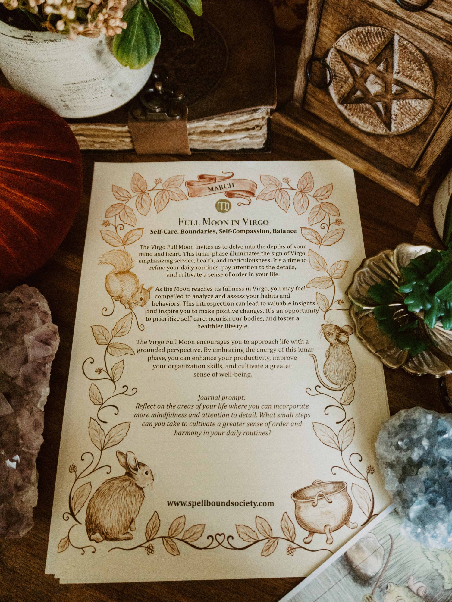 To help you with your monthly Moon Magic, I have written and hand-illustrated Grimoire pages for March Full and New Moon. As well as a page for you to set your intentions and wishes for the month.