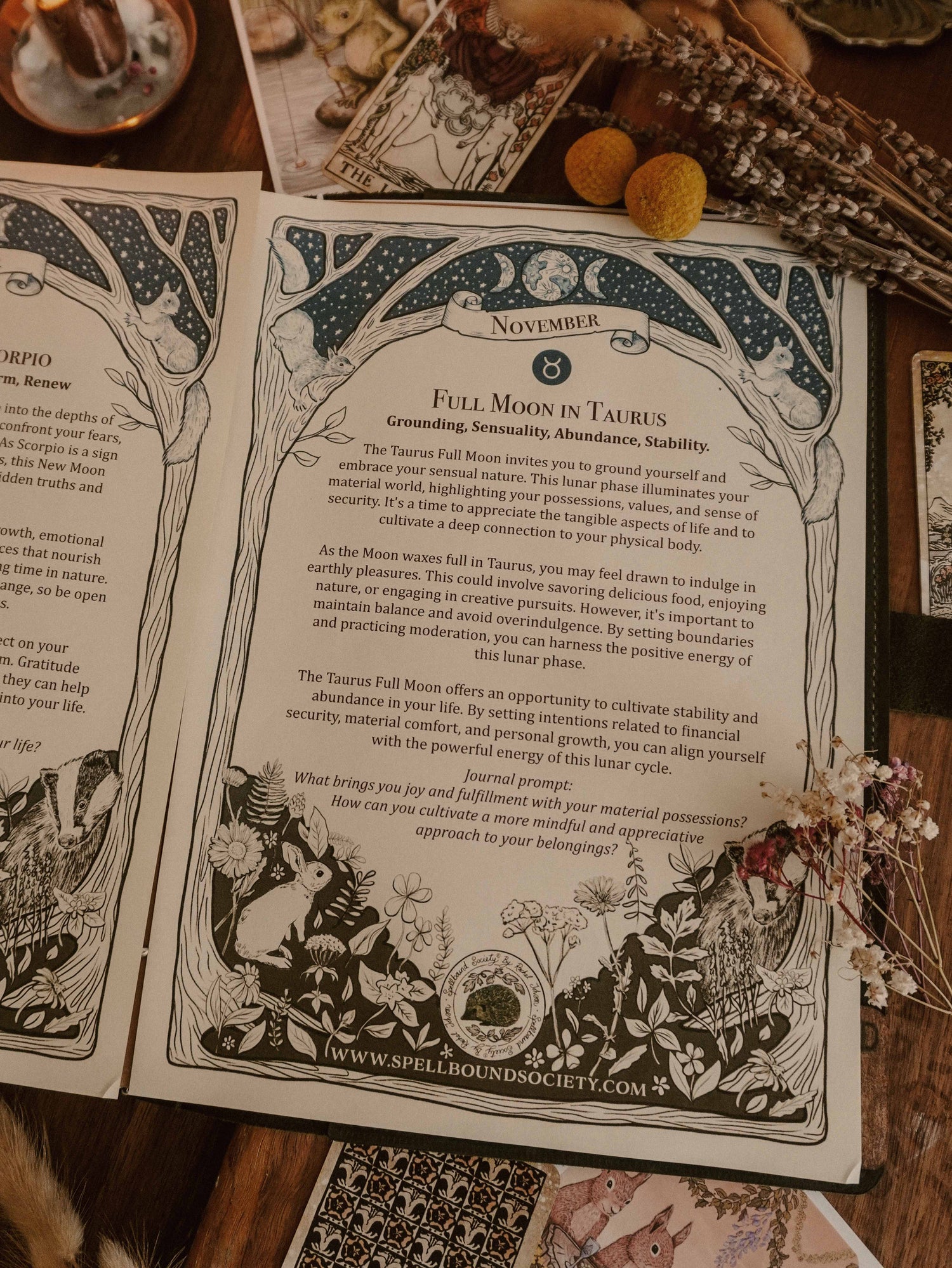 November's Full Moon is in Taurus, and the New Moon for November is in Scorpio. I illustrated and wrote a grimoire page to work with each of these Moon phases along with a monthly manifestation page, to write your wishes and dreams for the month.