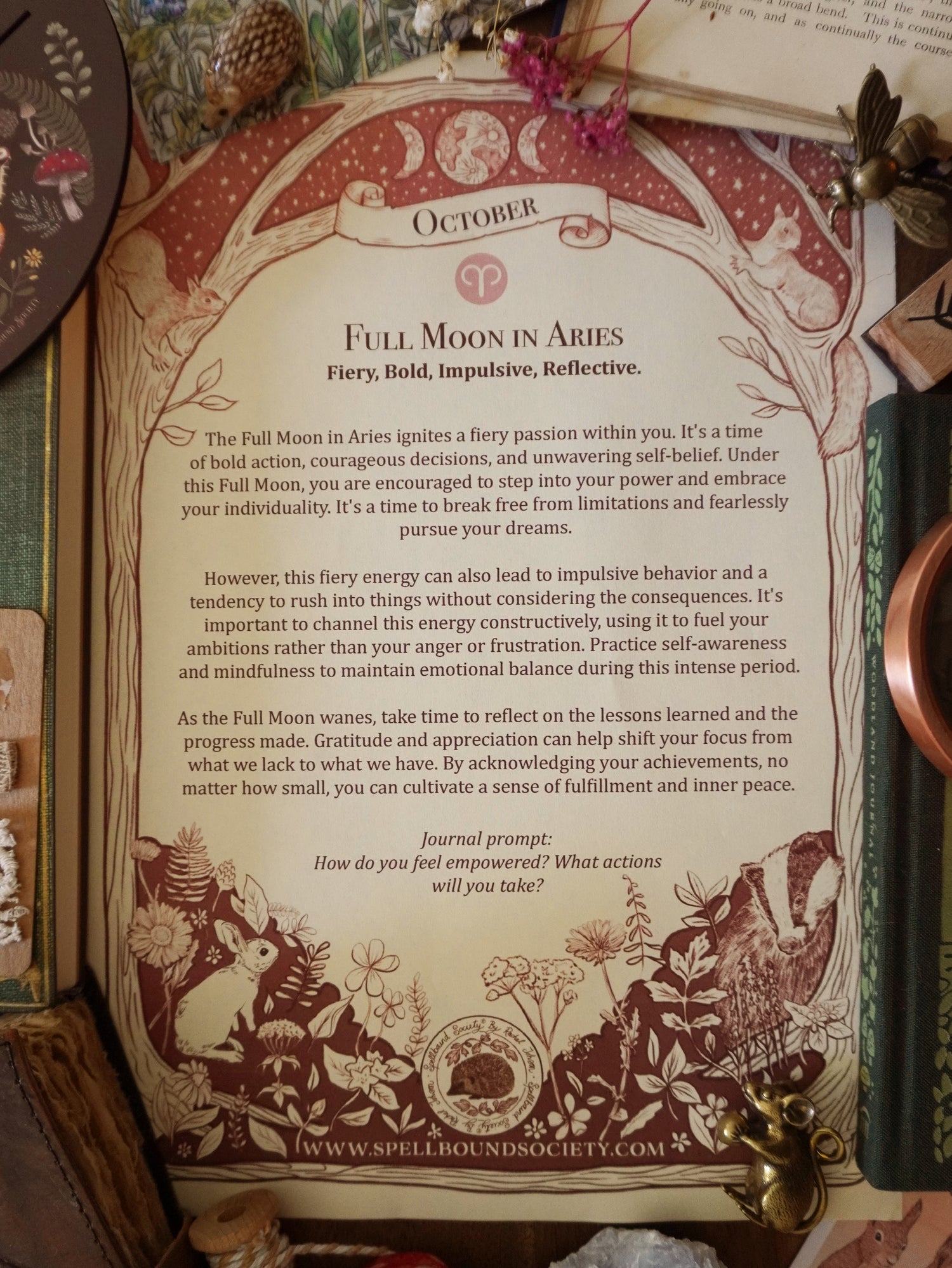 October's Full Moon is in Aries, and the New Moon for October is in Libra. I illustrated and wrote a grimoire page to work with each of these Moon phases along with a monthly manifestation page, to write your wishes and dreams for the month.
