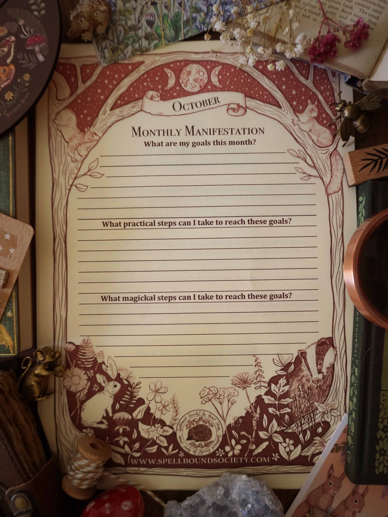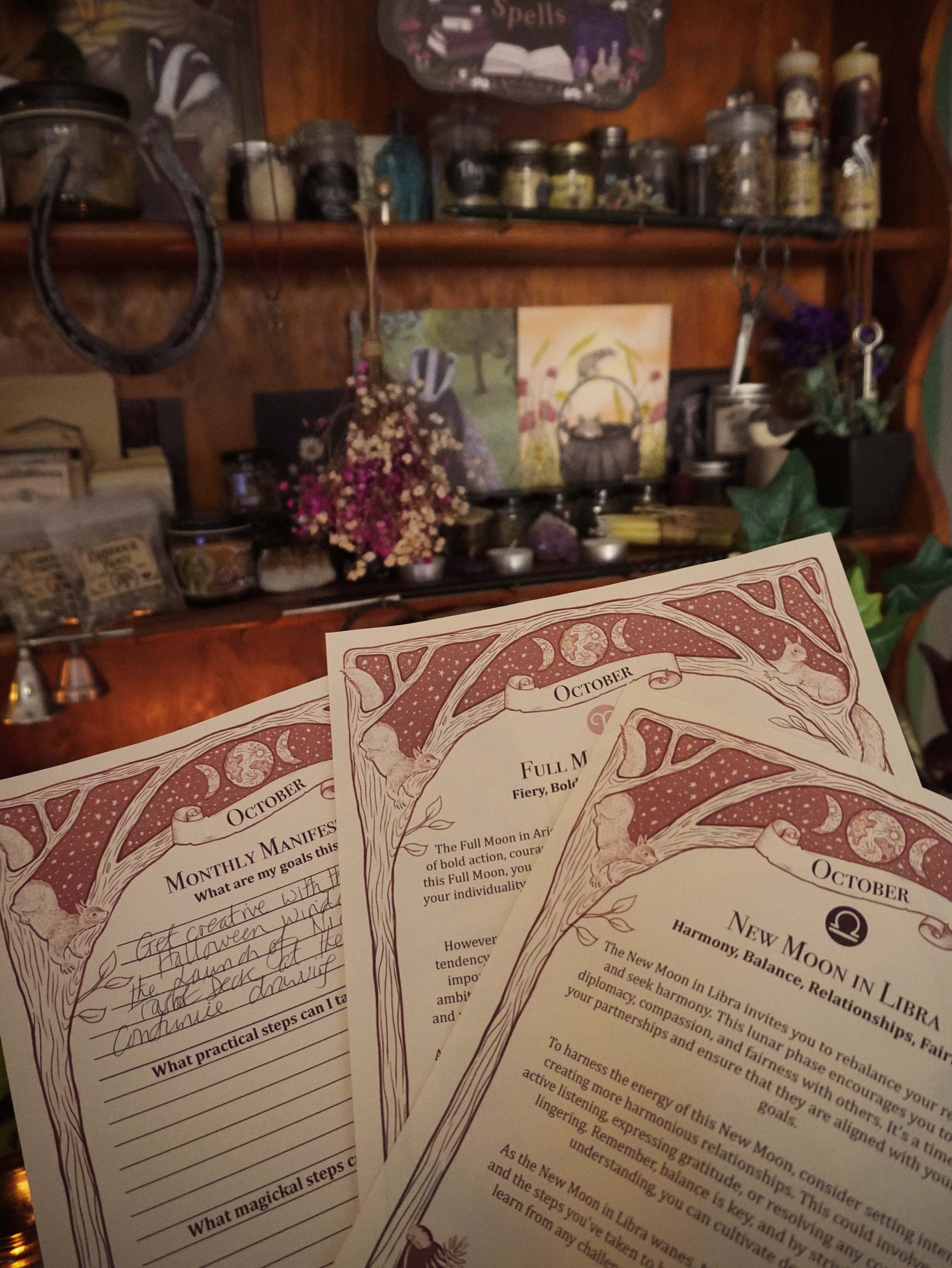 To help you with your monthly Moon Magic, I have written and hand-illustrated Grimoire pages for October's Full and New Moon. As well as a page for you to set your intentions and wishes for the month.