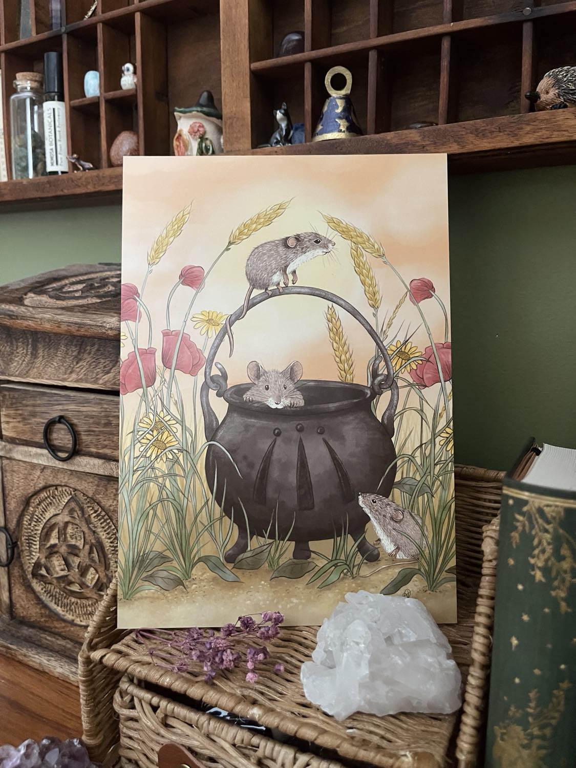 Hand Drawn Print of playful young Mice in the Witch’s Cauldron