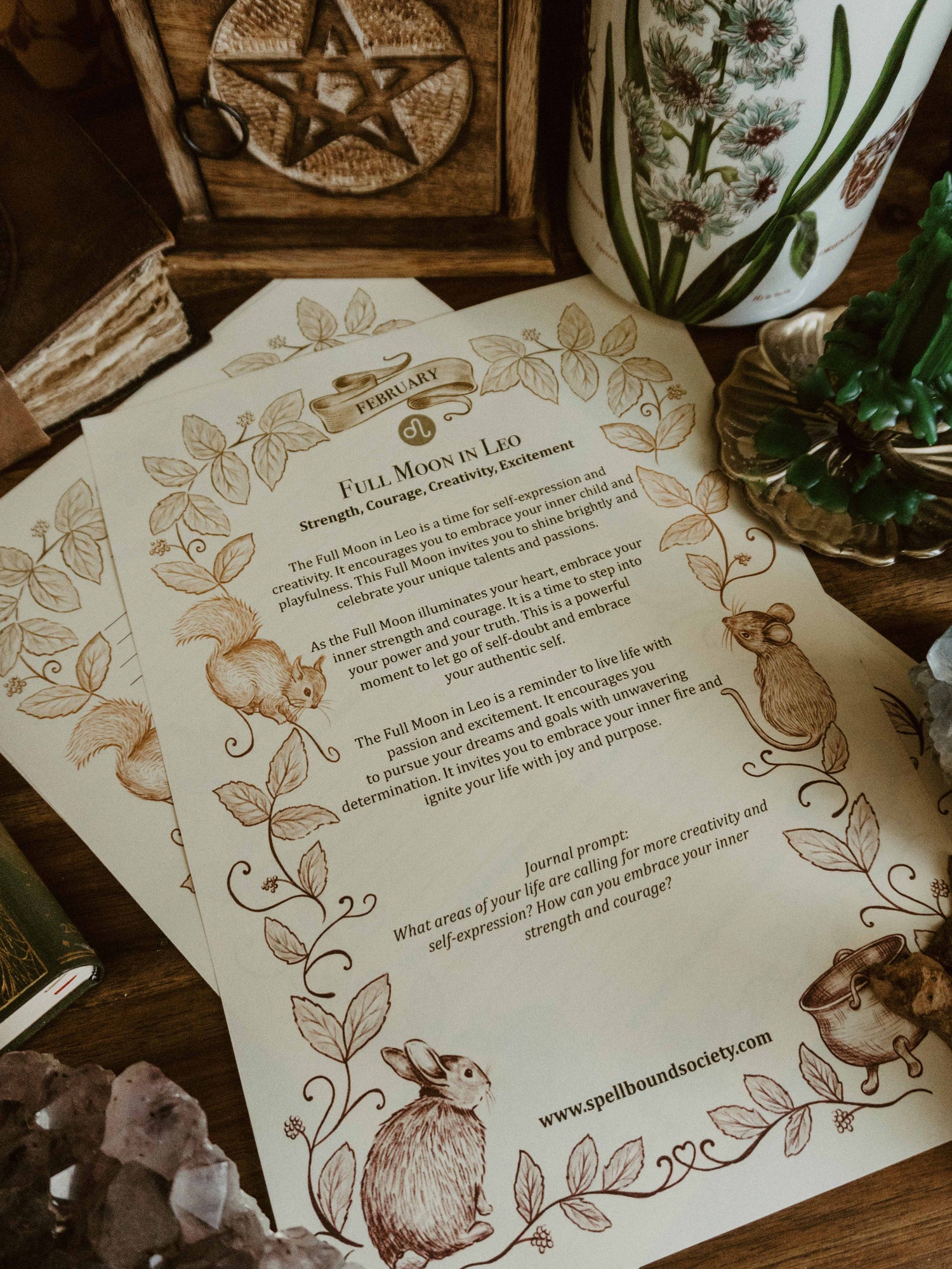 February's Full Moon is in Leo, and the New Moon for February is in Aquarius. I illustrated and wrote a grimoire page to work with each of these Moon phases along with a monthly manifestation page, to write your wishes and dreams for the month.