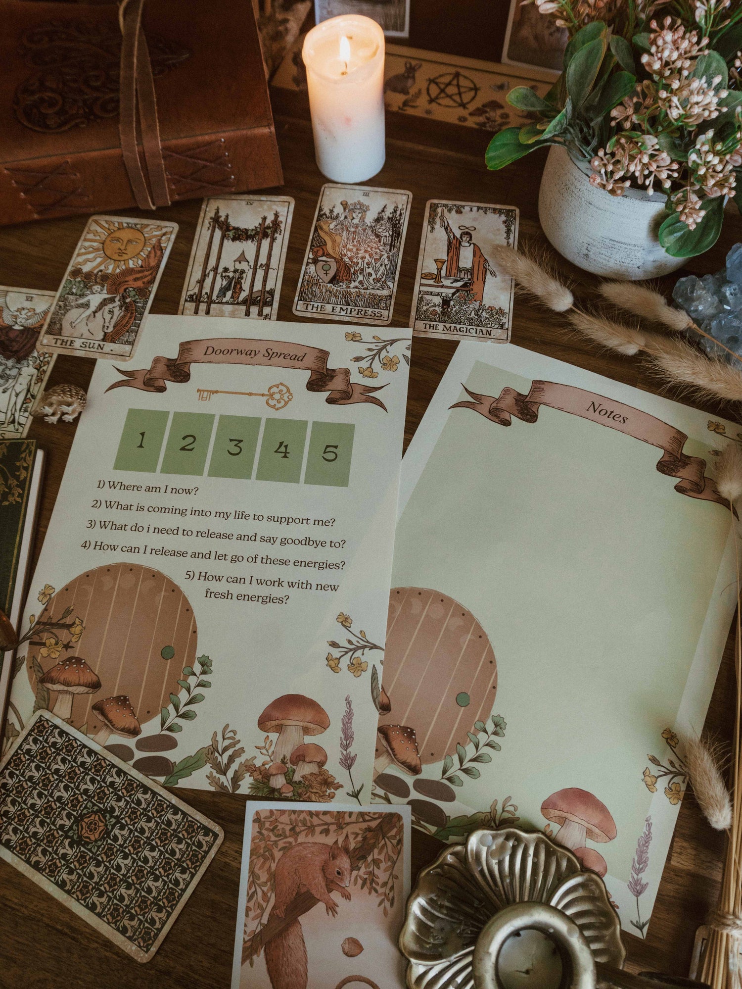 I call this the Doorway Spread, a layout born from the charm of a hobbit’s round, wooden door. It invites you to step into a quiet moment with your cards, discovering where you stand on your path, which energies are ready to be released back into the universe, and which new energies are waiting to guide you forward.