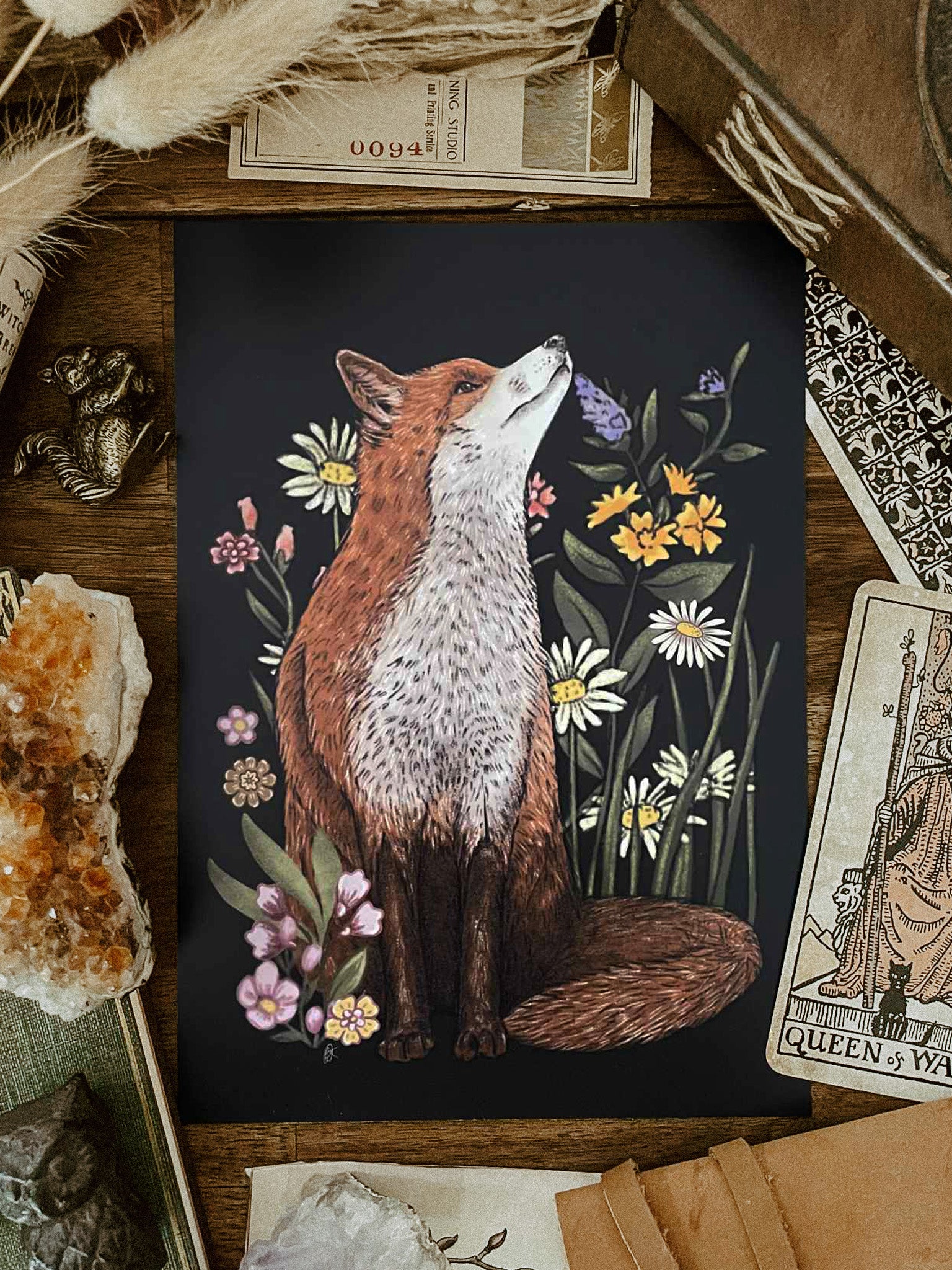 Moonlight Forest Fox Print, inspired by the magic of hedge row. The magical and cunning fox sitting surrounded by wildflowers, pondering his next move in his whimsical adventure.