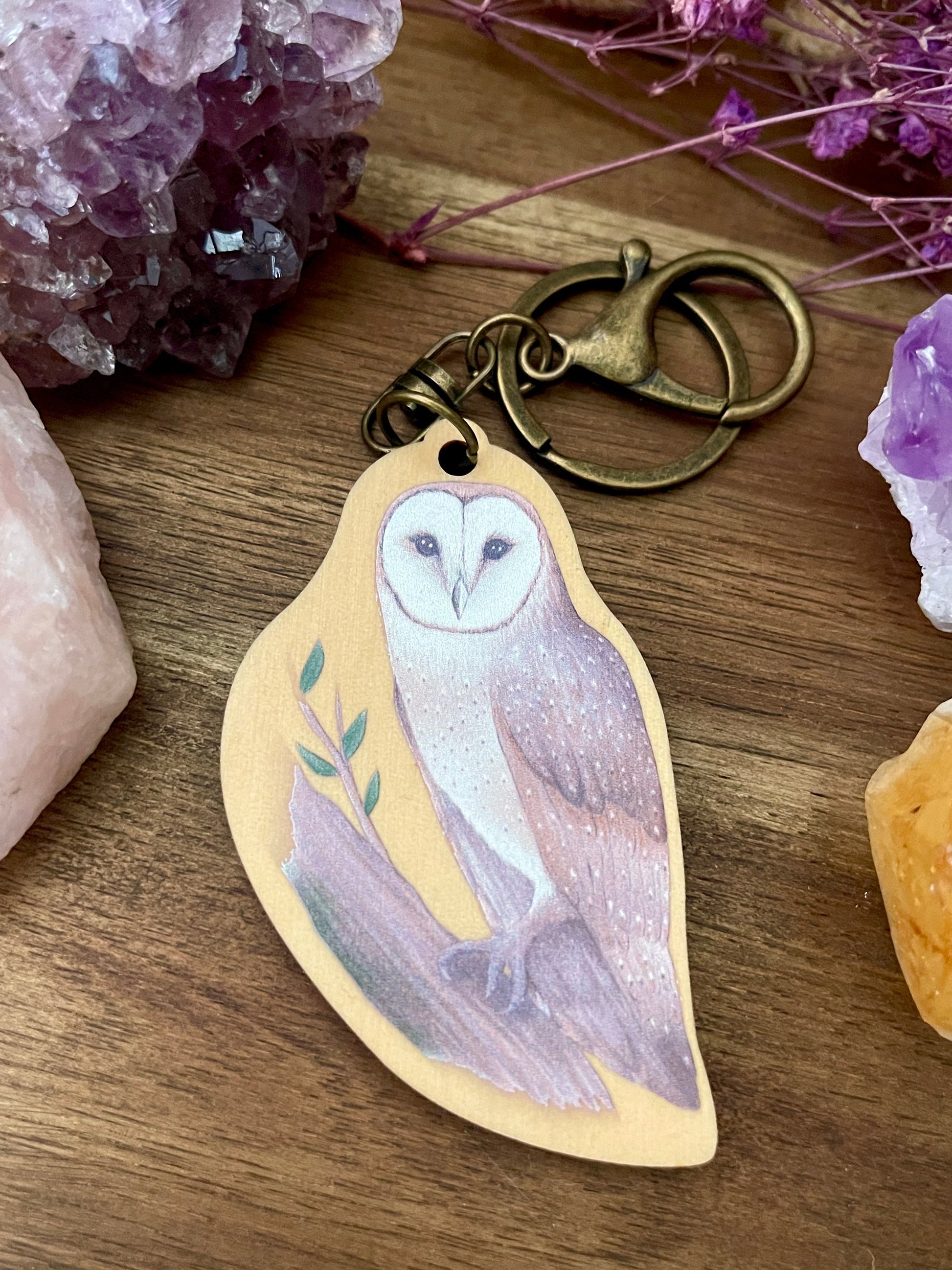 Wooden owl keyring. Artwork by Rachel Johnson made locally on the Gold Coast Australia. 8 x 4.5cm plus ring